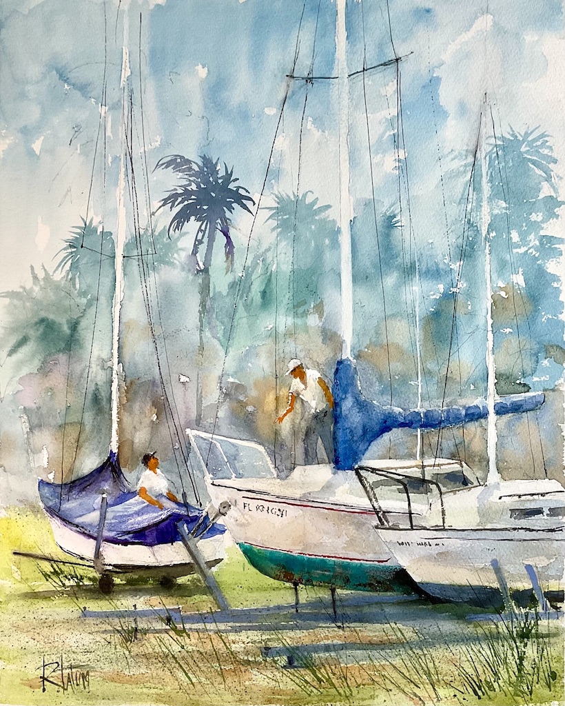 This is a common scene in boatyards. Sailers love tinkering with their boats and enjoying lively conversations about their crafts and boating adventures. This painting began en plein air and was completed in the comfort of my studio during a cold winter month.