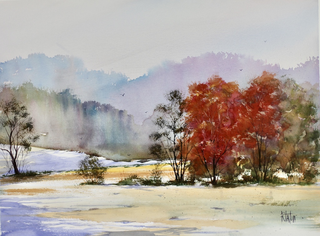 This painting is an early winter snow where the meadow colors are still warm affording an interesting contrast of the areas where snow has accumulated against those where the warm ground has melted the snow. It’s a special time of the year as the season changes. Original framed 30 x 40”. Limited Edition Giclee Prints available.