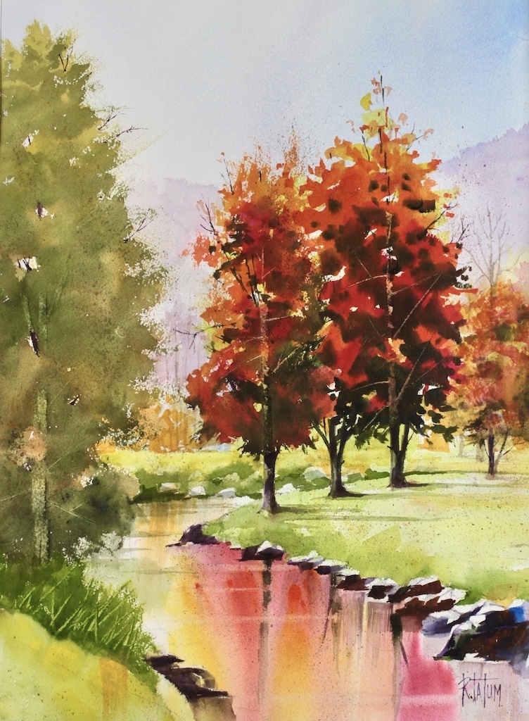 This Fall painting shows a portion of the Elk River as it flows through a beautiful community in the Carolina mountains. I used dynamic Fall colors and lots of contrast to make a strong statement. Original watercolors sold. Limited Edition Giclee prints available.