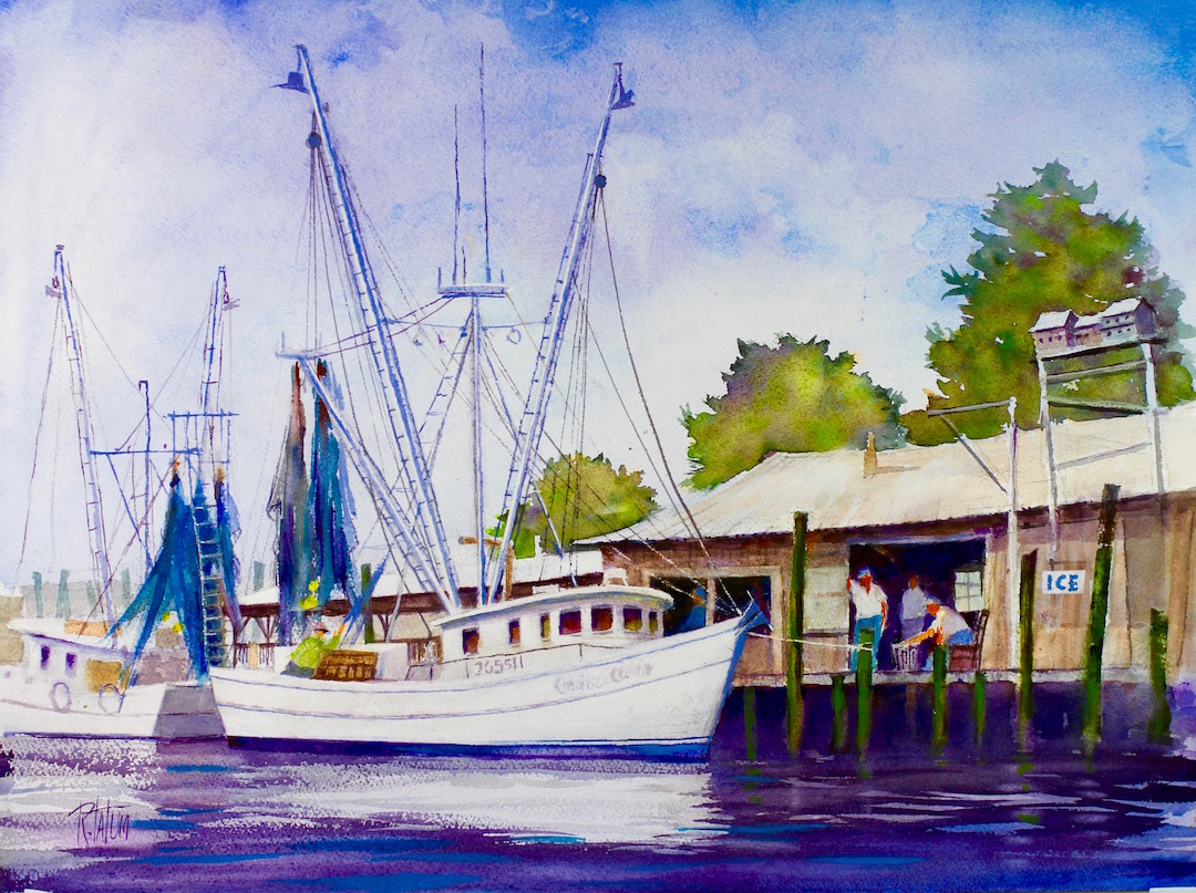 This is a popular spot for fresh local seafood in the old fishing village of Varnamtown, NC. It’s a busy working dock on the Lockwood Folly River. Fishermen bring their catches here for distribution to local seafood markets and restaurants. Local fishermen have made their. Living in this community for generations. It’s also a great spot to paint while soaking in the dockside ambiance. Original Watercolors Sold. Limited Edition Giclees available.