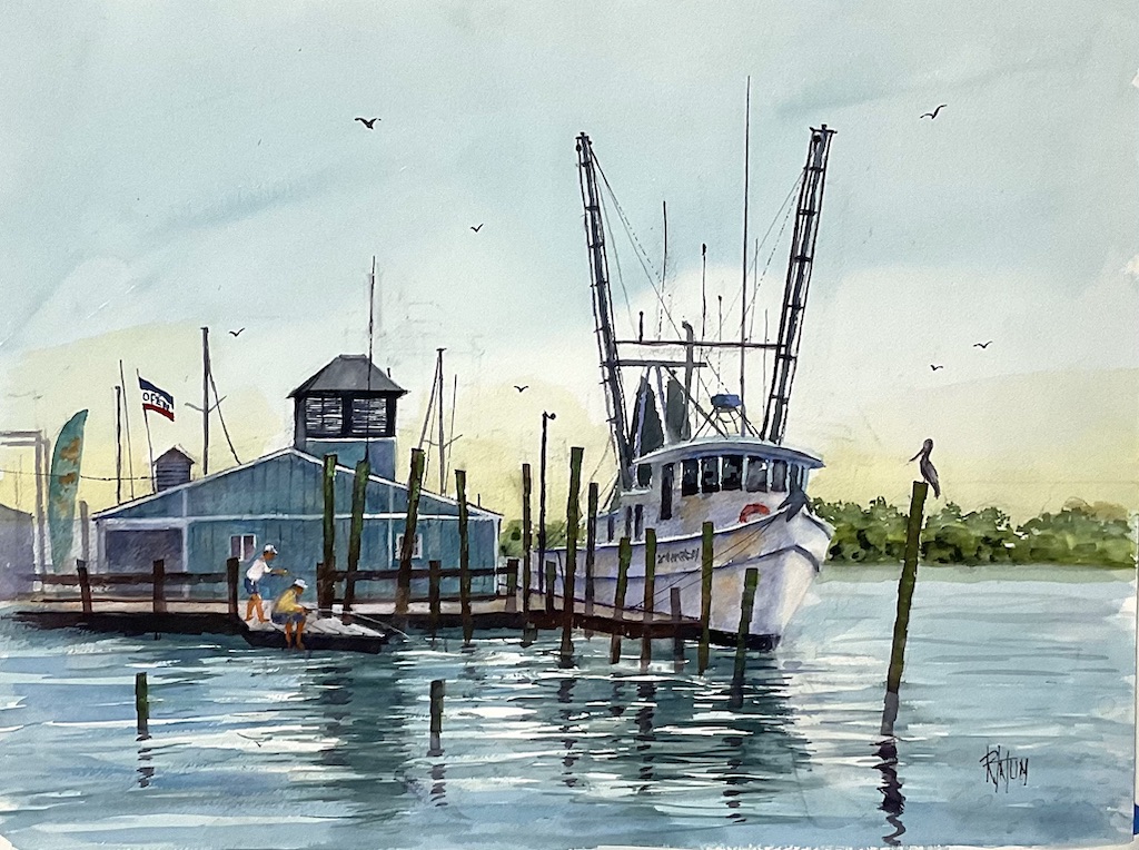 This old Fish House is at the location of the former Ferry Landing, which was the only way to access the island prior to the Bridge. Here you can purchase fresh shrimp and seafood of all kind provided by the local shrimpers fishermen. Original Watercolor is 18×24. Unframed price is $750