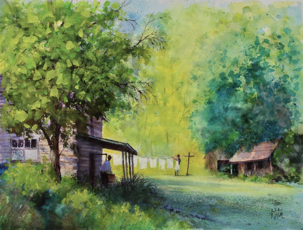 The Mast family has been long time residents of Valle Crucis in the North Carolina Mountains. Their general merchandise store has been essential to residents for more than 100 years and is on the Register of Historic Places.This painting uses the old Mast homestead complex to depict “laundry day” as it must have been over a hundred years ago.