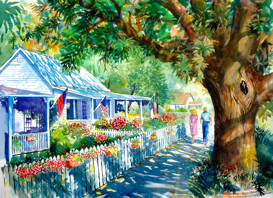 Classic bungalows from a by-gone era. Beautiful yards laden with Azaleas, live oaks, white fences and flags flying. A nice Spring day for a walk through history. Classic Southport Scene.