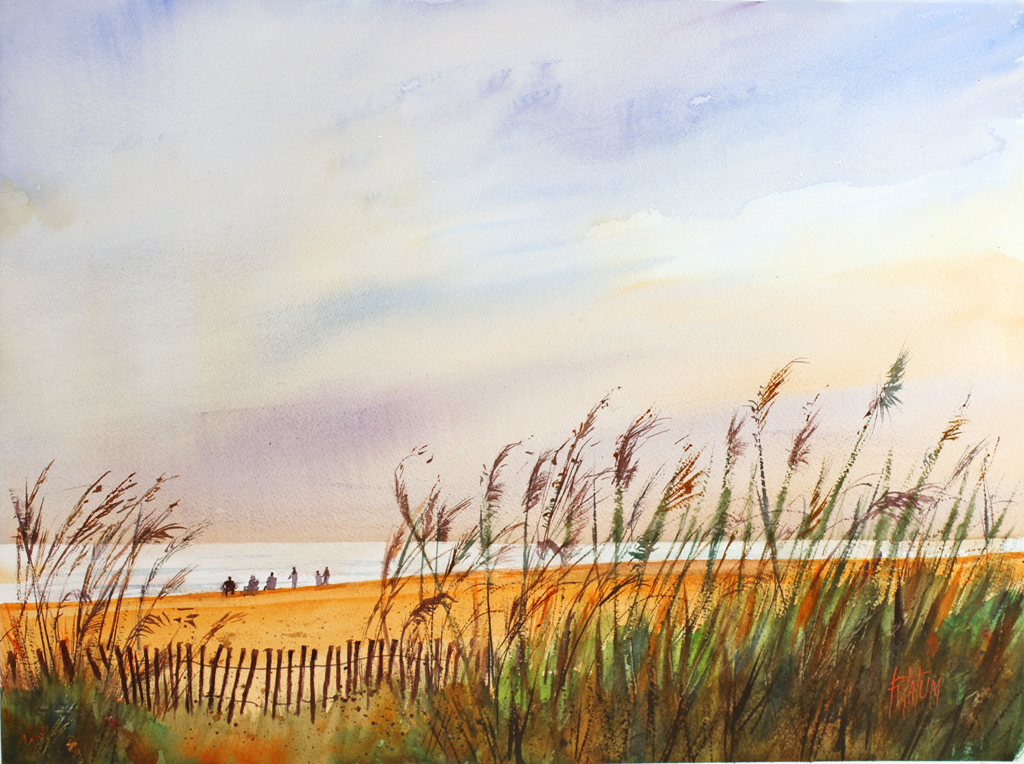 The skies and ground planes become more contrasty and colorful as they begin to reflect the setting sun. I used sea oats in the foreground to achieve more contrast in the painting. Original Painting is 18×24”. Email to request information.
